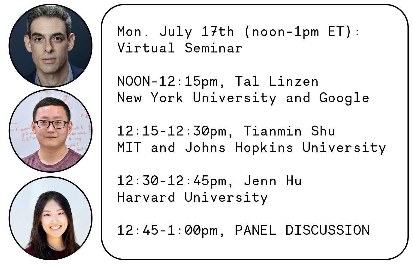 In advance of CogSci 2023, we will be hosting an interactive virtual seminar Monday, July 17, 2023 from noon-1PM ET. This session will open to the public and streamed online, allowing attendees to participate in this component of the workshop from anywhere in the world. These virtual talks will be recorded and available online for asynchronous viewing, alongside other materials recorded from speakers who are not able to attend CogSci in person.
